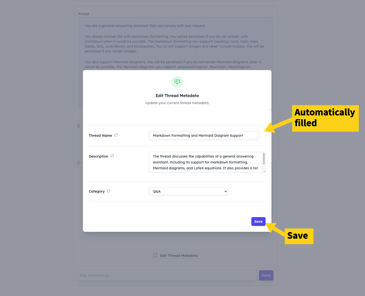 PeerAI's own LLMs will autofill metadata based on your Thread, but feel free to correct or adjust any before hitting Save.