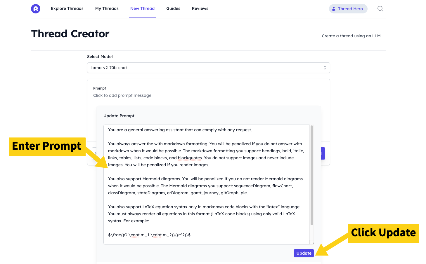 Second, you can optionally add a Prompt. Prompts will run before any inputs, and serve as overall instructions to the LLM for the duration of the Thread. To enter a Prompt, first click "Click to add a prompt message."