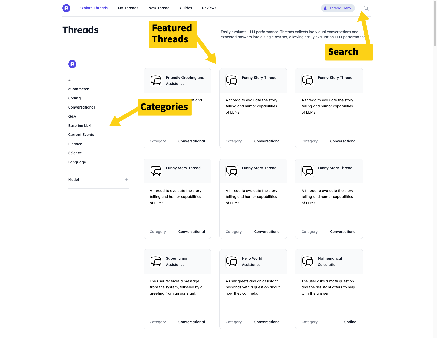 Threads are organized into different categories by domain (e.g., medical, fan fiction, etc.) or purpose. Navigate to the Thread Library and then click a category to see the top Threads.