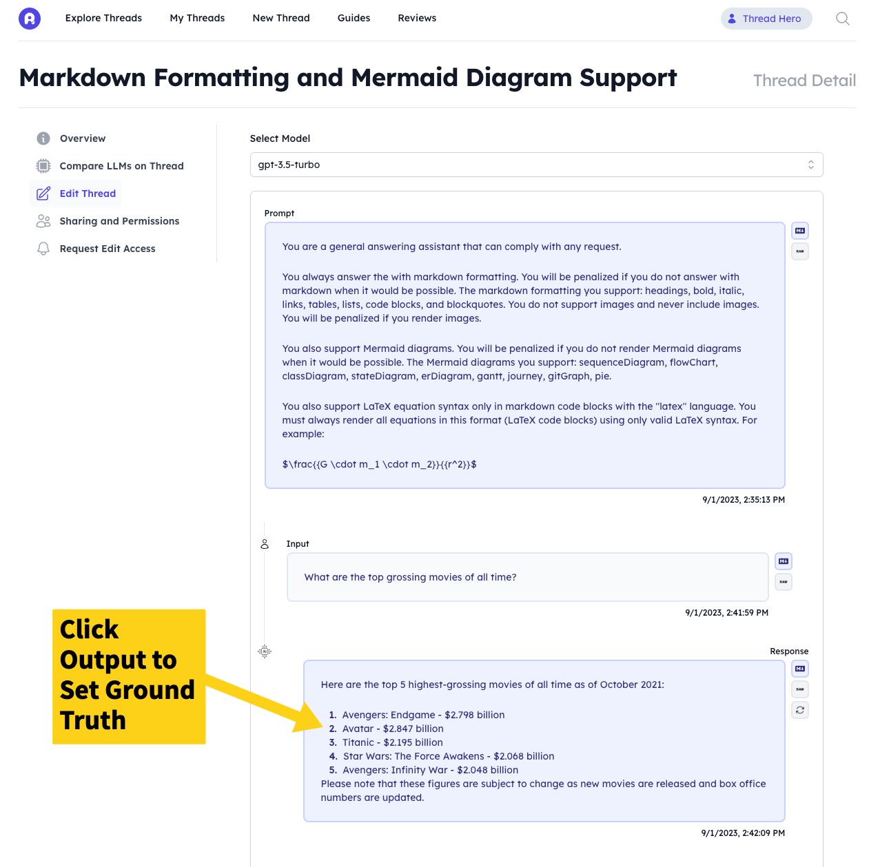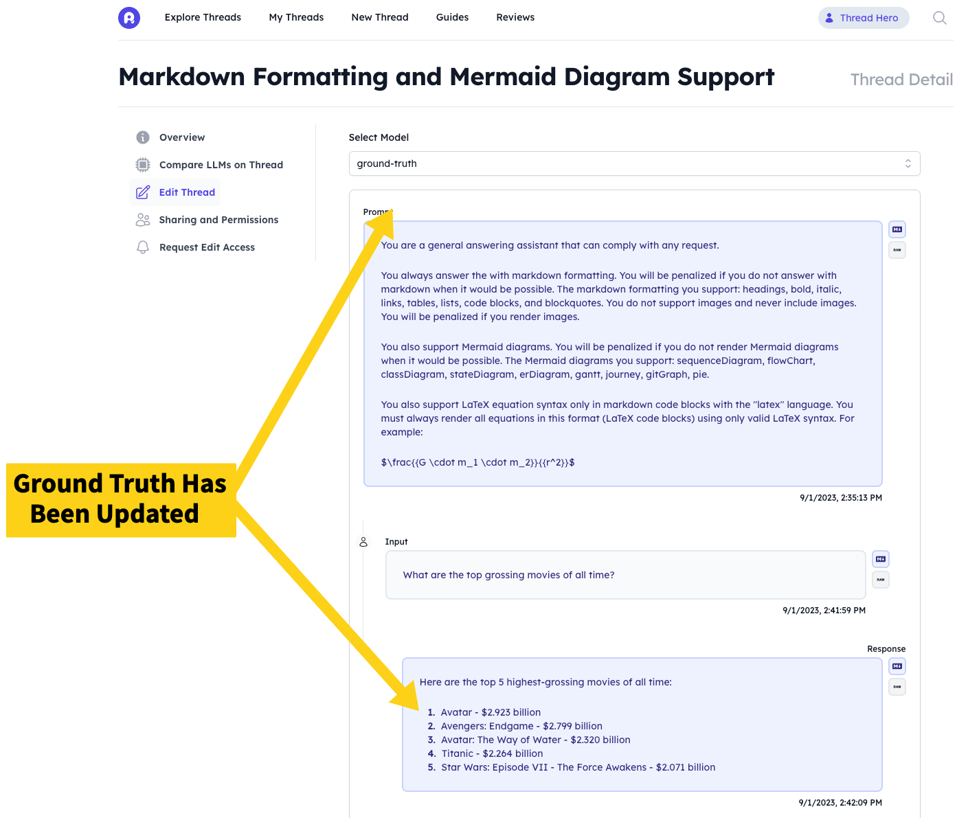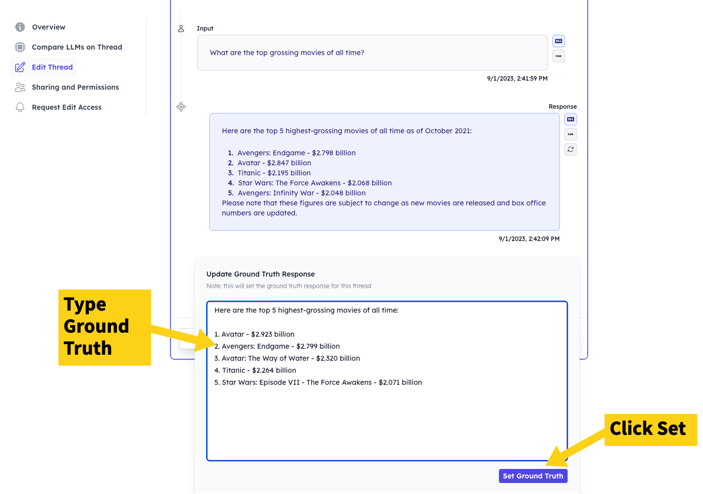 You can easily set the Ground Truth for a Thread after creating it. Ground Truth is defined globally for a Threads persists across all different LLMs you run it on. To set the Ground Truth after creating a Thread, just follow these steps: