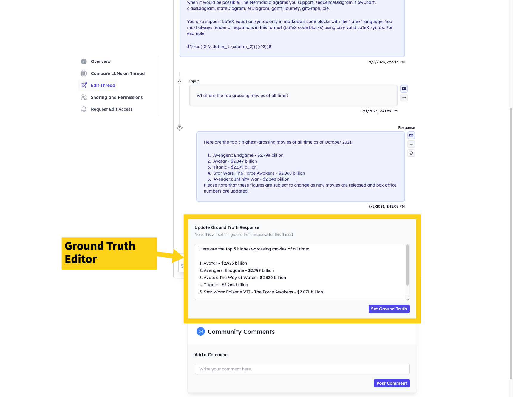 That's where the ground truth comes in. You together with the community can edit responses to show what "right" looks like. This is called setting the Ground Truth for your Thread.